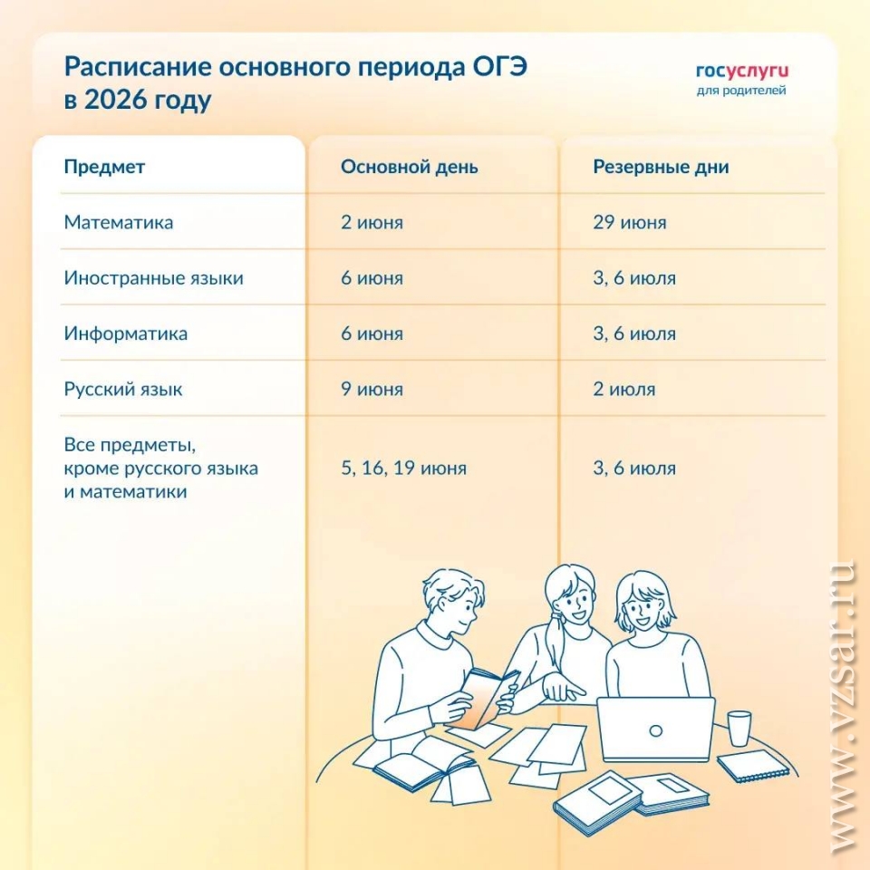 ОГЭ в 2026 году пройдет в три этапа: досрочный (с 21 апреля по 18 мая), основной (с 2 июня по 6 июля) и дополнительный (с 3 по 25 сентября).
