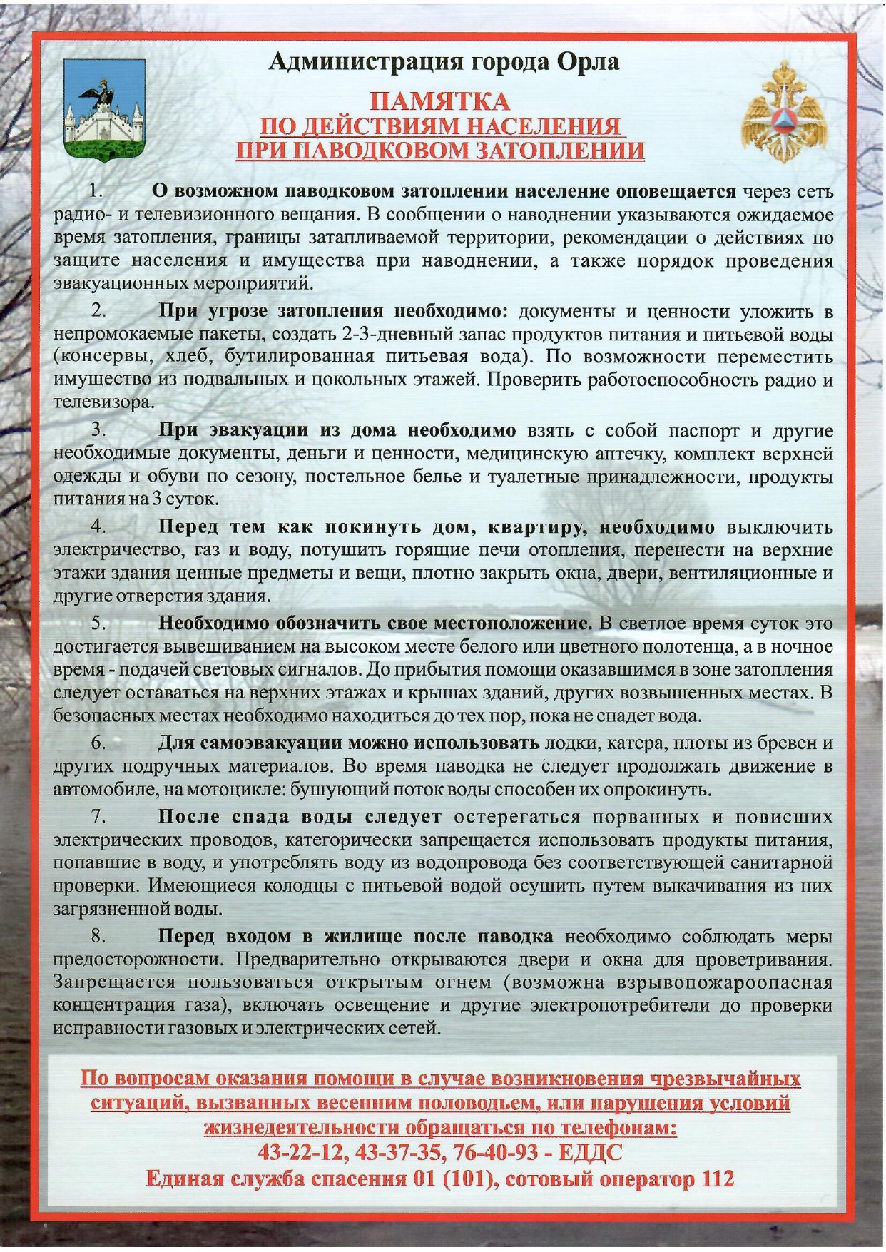 Комплекс мероприятий по пропаганде противопожарных знаний среди граждан, улучшению противопожарной устойчивости объектов проводится сотрудниками Главного управления МЧС России по Орловской области во взаимодействии с представителями органов местного самоуправления, социальной защиты, полиции, различных организаций, управляющих компаний и добровольными пожарными посредством сходов и подворовых обходов. Жителям напоминают о необходимости следить за исправностью отопительных приборов, газового оборудования и электропроводки, а также о запрете использования для обогрева открытых источников огня.
